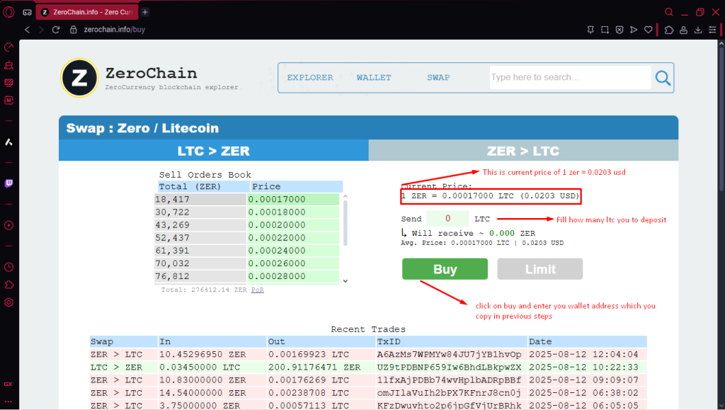 Once youβre in the Swap section, youβll see the current rate β for example, right now 1 ZER is $0.0203. The price fluctuates, so I recommend buying in bulk when itβs closer to $0.017 or $0.015 per ZER. You can check the price chart in the Swap section below.