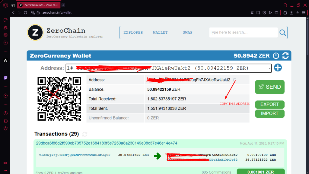 First, open your ZeroChain dashboard and copy your wallet address.