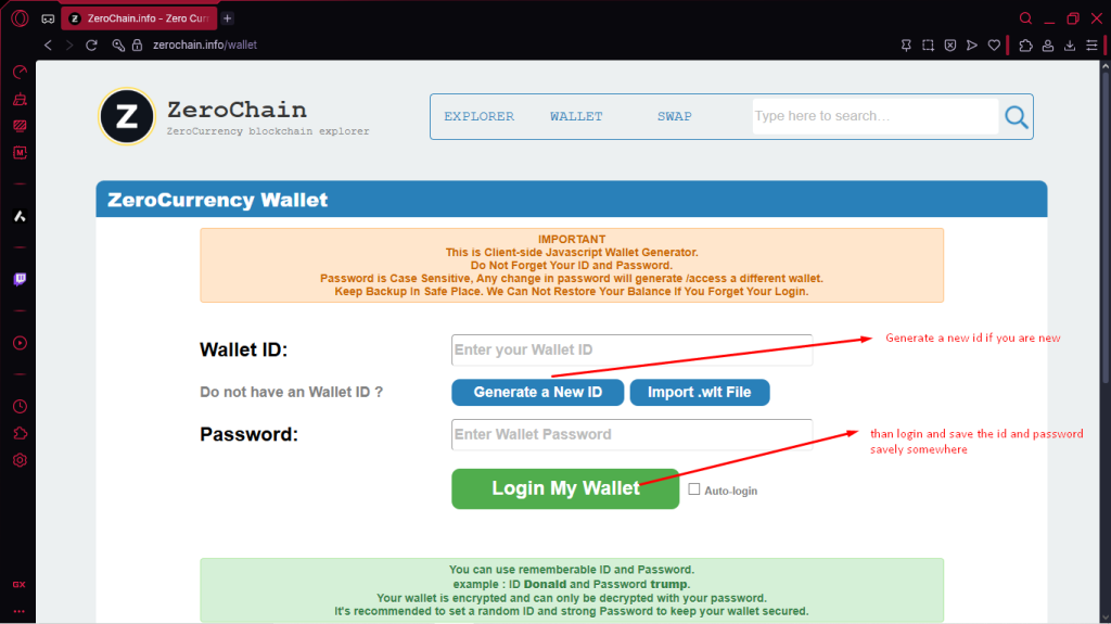 Go to zerochain.info and click Generate New Wallet. Once your wallet is created, download the password and wallet address, then store them safely in a secure location.