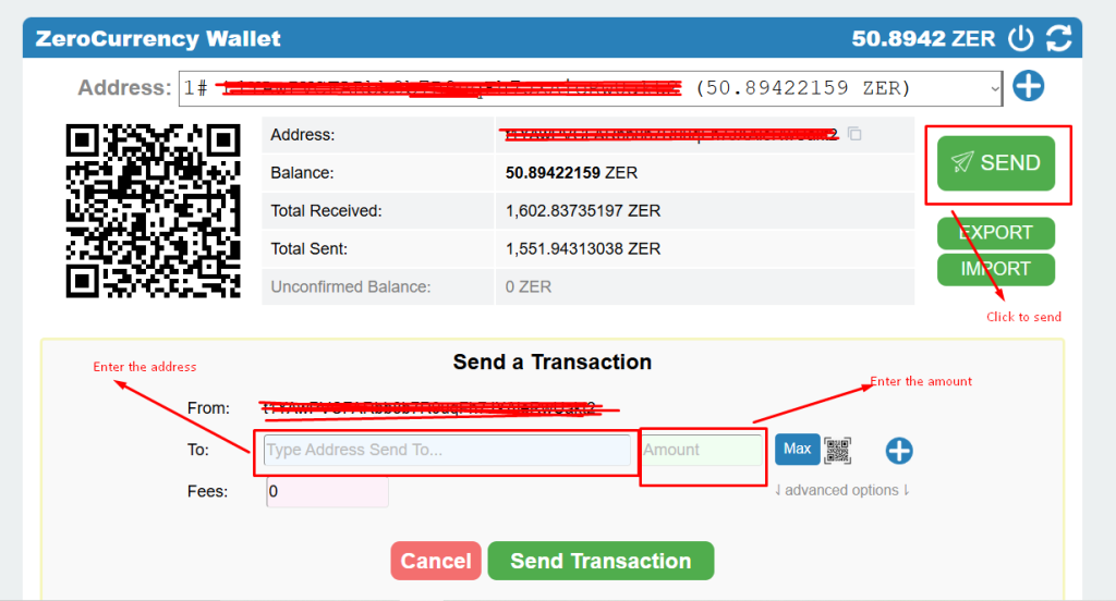 Next, go to ZeroChain, click Send, and paste the address you copied from ZerAds.