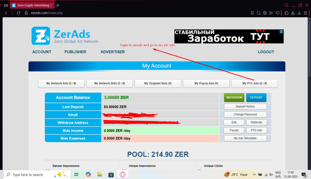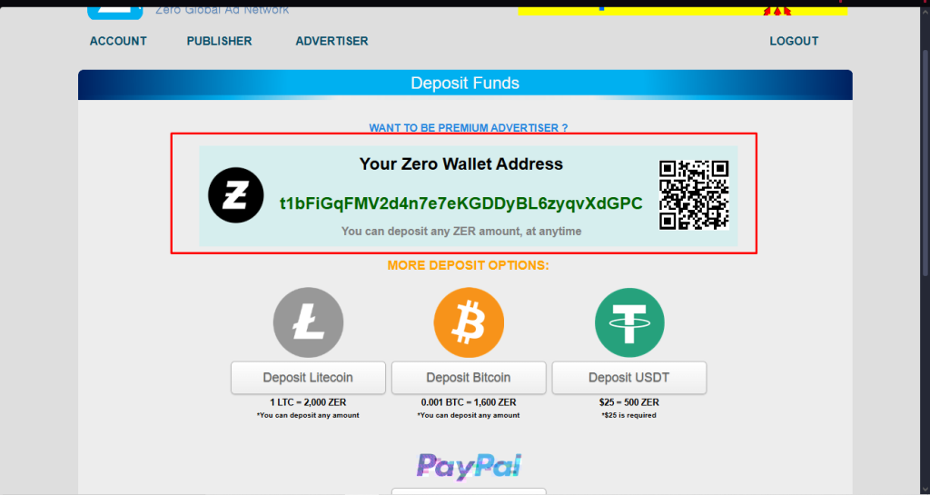 It may take a few minutes for your ZeroChain deposit to reach ZerAds. Once the transfer is complete, go to the PTC section.