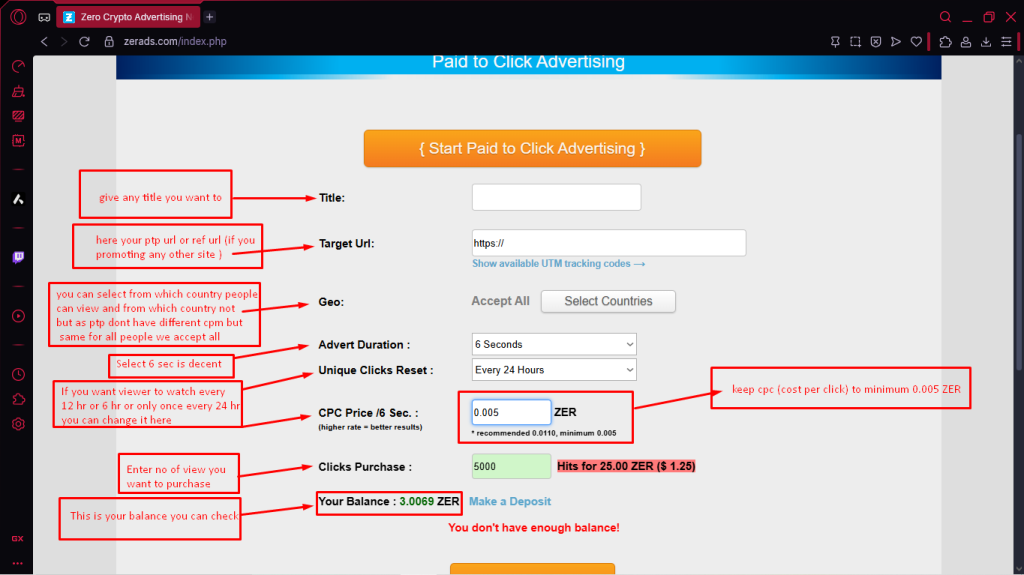 Now, enter a title, and in the Target URL field, add your PTP link or any referral link you want to promote. For the CPC Price, set it to 0.005 ZER (keep it at the minimum unless you have a specific reason to pay more). Next, enter the number of clicks you want to purchase and click Start PTC.